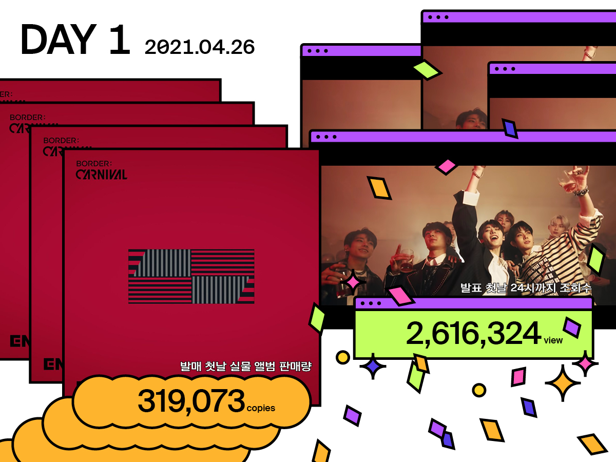 The songs on BORDER : CARNIVAL forego any particular genre and instead express the world ENHYPEN inhabits and the situations they encounter through consistent sound design and atmosphere. “Mixed Up,” for example, opens with an R&B melody on top of a hip hop beat, then almost casually turns into a rock song. But the sudden change in music is linked to the unexpected cost of ENHYPEN’s fame through the story of their rise to the “center of attention”—the ENHYPEN who performs on the carnival stage of a fantasy world, and the ENHYPEN who suddenly stepped into the limelight after their debut on an audition program, are “Mixed Up.” The versions of the group from the real world and the world of the album are mixed together as the BORDER : CARNIVAL ENHYPEN shares an experience like that of its real-world counterpart. Meanwhile, the music goes on to carve out a space for the world in the album by rendering the lines between various genres meaningless. The result of all this is the birth of a world, not only in the overall album but also each individual song, easily pieced together from K-pop—a musical genre which is itself a mix of other genres—fantasy, classics like Hamlet, and artists’ confessional stories. What’s more, that world allows each album to view the artist’s life as a story set in a place that exists apart from the real world. There’s a lyric in “Outro: The Wormhole,” the album’s closing song: “Multiple dimensions wait for us.” This may be more than the story of ENHYPEN. Genres once seen to exist almost in different dimensions have merged into one. And from them, something new has emerged: A kind of K-pop born from within the K-pop world but which has gone on to reach a whole new level.