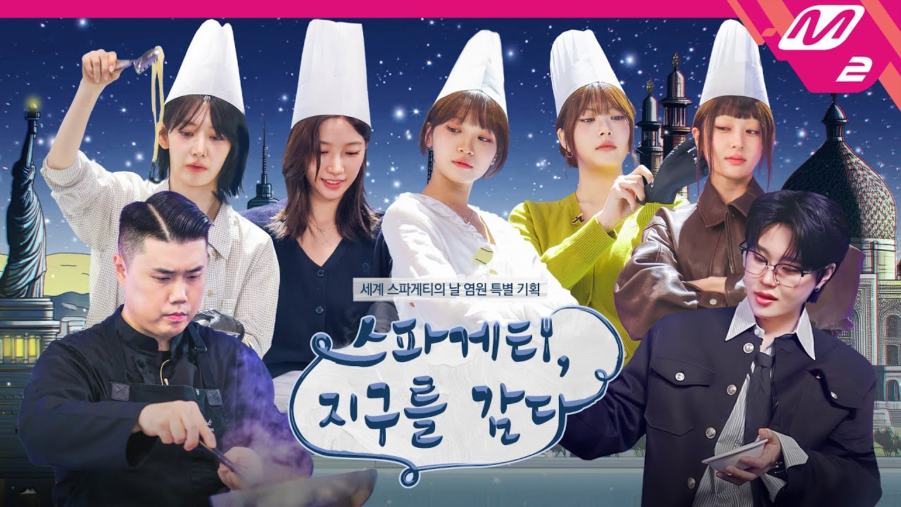 Yee Siyeon: “Born in fire, passing through water—the strand that landed on a plate!” It’s a prelude so grand it could be the opening to a legend, but what it’s really talking about is none other than spaghetti. “Spaghetti, Wrapping the Earth” is a heartfelt special that hopes to help in establishing World Spaghetti Day, a dream shared by people around the world and championed by LE SSERAFIM. The title might make it sound like a current affairs program, but it’s actually the girl group’s comeback show on Mnet and M2 marking the release of their single “SPAGHETTI.” “Spaghetti, Wrapping the Earth” represents a new kind of Mnet comeback show—one filled with variety show skits centered around the theme of spaghetti. The show’s first segment, taking place in a so-called “flirting hell restaurant,” features popular comedian Eom Jiyoon’s alter ego, handsome and gentle influencer chef Eom Jihoon. With their cameras rolling KIM CHAEWON and HONG EUNCHAE drop by Jihoon’s restaurant, Got The Um, where they’re greeted by flirty waitstaff member KAZUHA, who charmingly announces that “guests who are way brighter than our lights just showed up.” Meanwhile, HUH YUNJIN comes in to interview for a part-time job, only to encounter delivery worker SAKURA, whose own flirting skills are on another level. The LE SSERAFIM members take their roles and the shameless flirtation in the skit seriously, with hilariously clever performances.