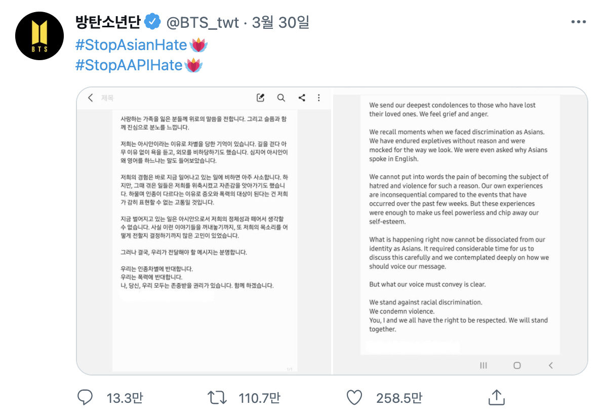 결정이 내려지기까지 시민들의 의견 개진과 저항이 큰 역할을 했다. 특히 이번 사건에는 아시아계 유명인들이 본인의 플랫폼을 활용해 적극적으로 목소리를 냈다. 한국계 캐나다-미국인 배우 샌드라 오는 피츠버그에서 열린 거리 집회에 나가 직접 발언했고, 애틀랜타 토박이 출신 가수 에릭 남은 ‘타임’지 기고와 CNN 인터뷰를 통해 아시아인 인권 위협에 대한 강경한 입장을 밝혔다. 각종 SNS에 해시태그 #StopAsianHate와 #StopAAPIHate(AAPI: 아시안 아메리칸과 퍼시픽 아일랜더 인종을 아우르는 말)와 함께 아시아인을 존중하라는 규탄 성명이 줄을 이었다. 그리고 3월 29일, 방탄소년단도 트위터 계정에 이 해시태그를 단 입장문을 올렸다. 애틀랜타 참사 유족에게 보내는 위로, 본인들이 직접 경험한 차별 그리고 아시아인으로서 정체성 의식을 담은 이 짧은 글은 순식간에 기하급수적으로 리트윗되어 전 세계로 퍼졌다.