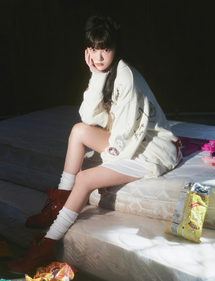 EUNCHAE sipped on the iced tea she had brought in with her to the interview as she chatted in a quiet voice about plum kelp, planet gummies, Capri Sun and her greatest fear: ghosts. But she laughed slowly and brightly as she said, “FEARNOT is so much more precious to me now than I could’ve imagined and they helped me realize I can be a happy person, too.”