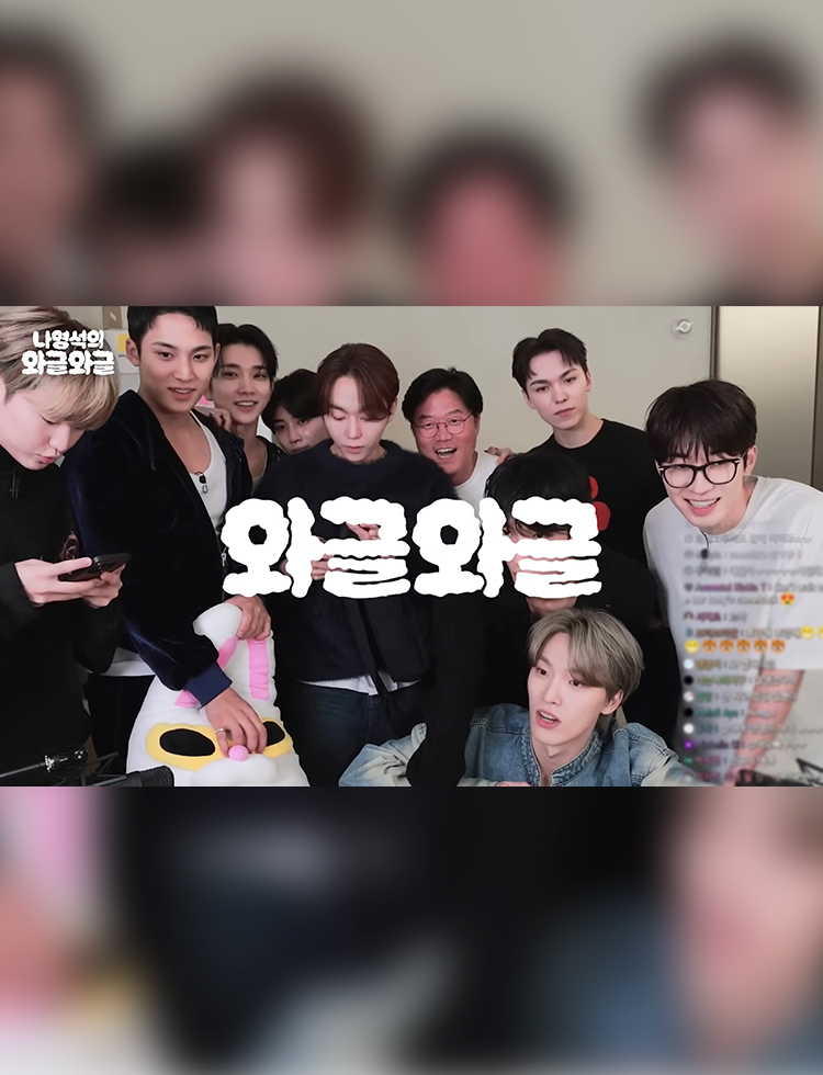 Yoon Haein: Chattering with Nah is the group version of Nattering with Nah, a YouTube series from Channel Fullmoon where producer Nah Yung Suk brings in his friends and acquaintances to natter over food and drinks—and as MINGYU quickly figured out, “Nattering became Chattering because it’s a large group.” Chattering with Nah begins abruptly when WONWOO visits the Egg Is Coming headquarters, which houses Channel Fullmoon. The whole series is overflowing with chemistry between Nah and the members of SEVENTEEN—a dynamic they first discovered while filming NANA TOUR, which was itself spurred on by a wish DK had on another series, The Game Caterers.