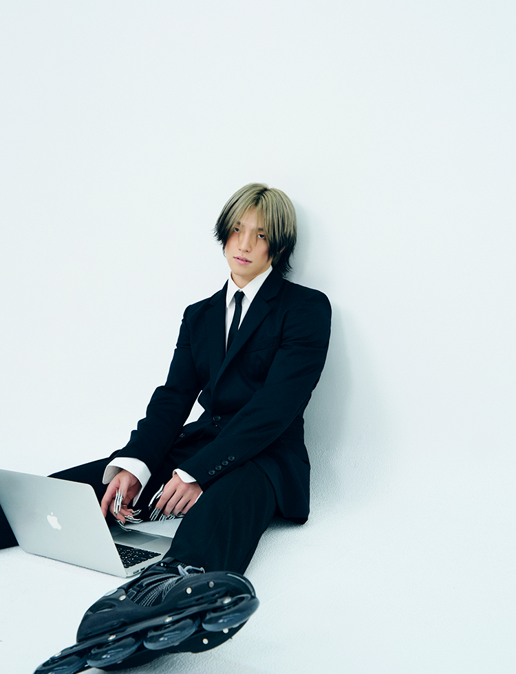 缎面西服外套和领带来自JOHN LAWRENCE SULLIVAN,衬衫来自LEE y. LEE y.,皮靴为JOHN LAWRENCE SULLIVAN × GROUNDS,竹节项链和纪念碑项链、竹节重手镯(左)、竹节手镯(右)来自ISHI、长裤和其他项链、系带为造型师个人藏品。