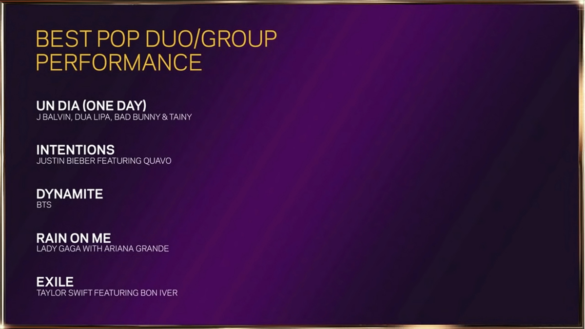 If BTS win here, it will be a first for any K-pop artist. It should be clear from looking at the nominees that the recipient of this award does not strictly have to be a “group.” Outside of BTS’s nomination, the list is entirely collaborations between one artist and another featuring on their song. In fact, outside of wins by Twenty One Pilots and Portugal. The Man, the award has gone to a collaboration every year since its inception in 2012. Meanwhile, if Lady Gaga takes the prize with Ariana Grande, it will be Gaga’s second win in the category—her first being with Bradley Cooper—and she will become the only artist to hold that record.