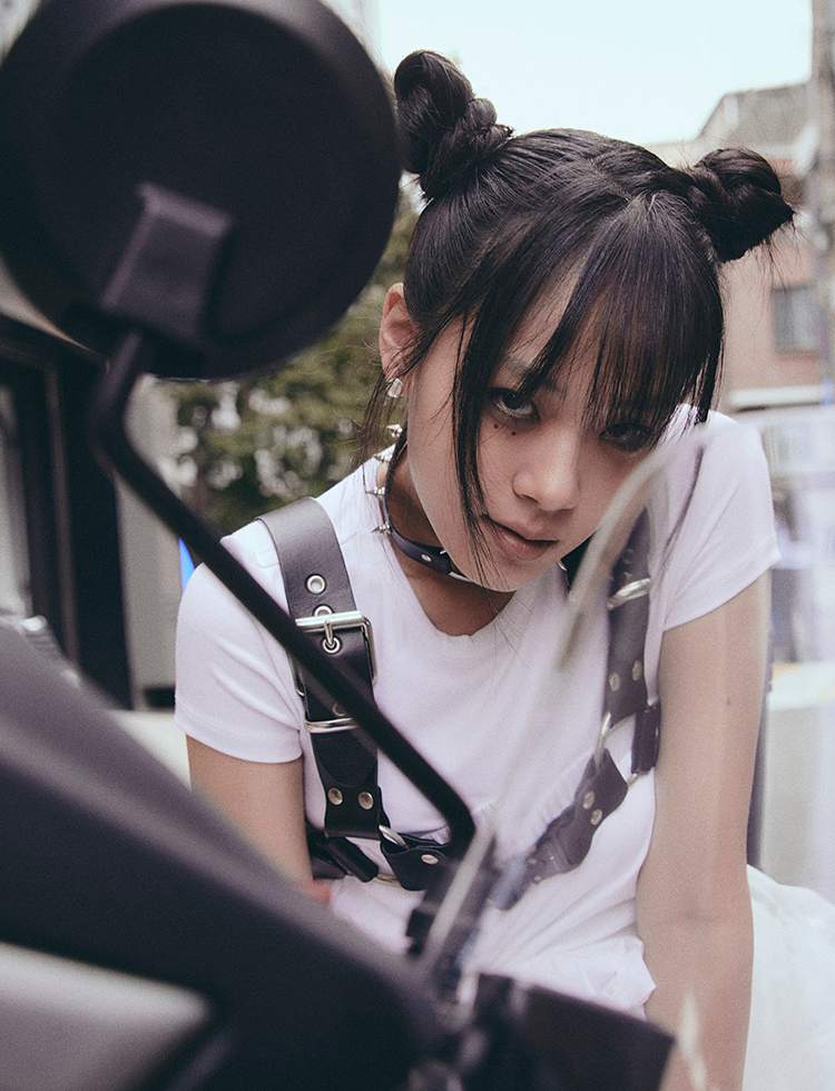 BIBI着用のインナー・ホワイト・トップはZARA、ホワイト・ウォーカーブーツはLost In Echo、ハーネス及びチョーカーはスタイリスト所有品。